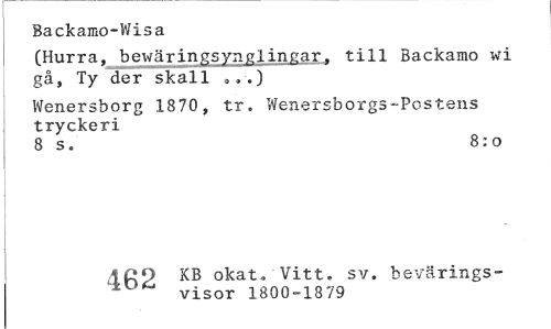 //// Backamo-Wisa //// (Hurra, bewäringsynglingar. till Backamo wi gå, Ty der skall ..-.) //// Wenersborg 1870, tr. Wenersborgs-Postens tryckeri //// 8 s. 8:0 //// 4.R2 KB okat» Vitt. sv, bevärings- //// visor 1800-1879 ////