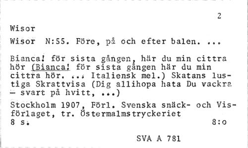 //// 2 //// Wisor //// Wisor N:55. Före, på och efter balen. ... //// Biancal för sista gången, här du min cittra hör (Biancai för sista gången här du min cittra hör. Italiensk mel.) Skatans lustiga Skrattvisa (Dig allihopa hata Du vackra - svart på hvitt, .*.) //// Stockholm 1907, Förl. Svenska snäck- och Visförlaget, tr. ös termalmstryckeriet 8 s. 8:o //// SVA A 7 81 ////