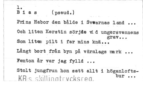 //// 1. //// Bias (pseud.) //// Prins Habor den bålde i Svwarnas land ... //// Och liten Kerstin sörjde vL d ungersvennens //// grav... //// Som litai pilt i far mins knä... //// Långt bort från byn på värnlags mark ... //// Femton år var jag fylld ... //// Stolt jungfrun hon satt allt i höganlofts- //// I Kfc^skUlinntrvcksrecL bur ////