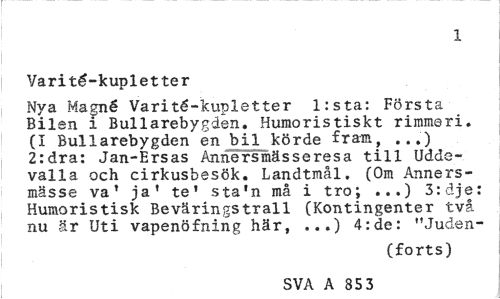//// 1 //// Varité-kupletter //// Nya Magné Varité-kupletter l:sta: Första Bilen I Bullarebygden. Humoristiskt rimmeri. (I Bullarebygden en bil körde fram, ...) 2:dra: Jan-Ersas Annersmässeresa till Uddevalla och cirkusbesök. Landtmål. (Om Anners-mässe va' ja* te' sta'n må i tro; ...) 3:dje: Humoristisk Beväringstrall (Kontingenter två nu är Uti vapenöfning här, ...) 4:de: "Juden- //// (forts) //// SVA A 85 3 ////