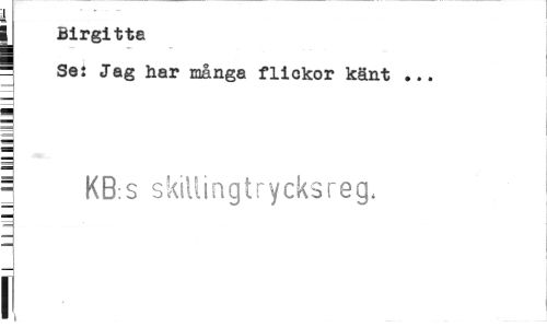 //// [ //// j Birgitta //// Se: Jag har många flickor känt ... //// = KB:s skillingtrycksreg. [ ////