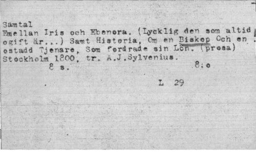 //// Samtal //// Emellan Iris och "Efcsnora. (t^yclclls den so-n altid ogift är...) 3an?t Historia, Om en Biskop Och en ostadd Tjenare,. Soro fordrade sin LcTTfTprosa) Stockholm iP.OO, tr. A.J ,3ylvenius . //// t s. 8;o //// L 29 ////