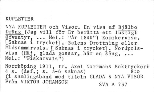 //// KUPLETTER //// NYA KUPLETTER och Visor. En visa af Bjälbo Dräng (Jag vill för Er berätta ett lustigt äfventyr, ... Mel.: "År 1840") Komikervisa. [Saknas i trycket!. Balens Drottning eller Midsommarvals. T Saknas i trycket! . Nordpolsvisa (Hä j , gladda gossar, här en sång, ... Mel.: "Fiskarvals") //// Norrköping 1911, tr. Axel Norrmans Boktryckeri 4 s. (def,; s. 3-6 saknas) 8:o //// (i samlingsband med titeln GLADA & NYA VISOR Från VIKTOR JOHANSON SVA A 737 ////