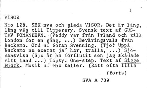 //// 1 //// VISOR //// Nio 128. SEX nya och glada VISOR. Det är lång, lång väg till Ti"jperary. Svensk text af GUSTAV FONANDERN. (Peddy var från Irland och till London for en gång, Beväringsvals från //// Backanio. Ord af Göran Svenning. (TjoJ Uppå Backamo nu exerat ja" har, tralla, ...) Sjömansvisa (Sju år ha förflutit sen jag skådade mitt land ...) Topsy. One-step. Text af Sigge ftifirk. Musik af Max Keller. (Rätt ofta lilla //// (forts) //// SVA A 709 ////