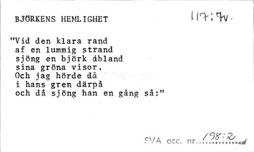 //// BJÖRKENS HEMLIGHET U^i^W- //// "Vid den klara rand af en lummig strand sjöng en björk dbland sina gröna visor. Och jag hörde då i hans gren därpå och då sjöng han en gång så:" //// SVA cscc. ////