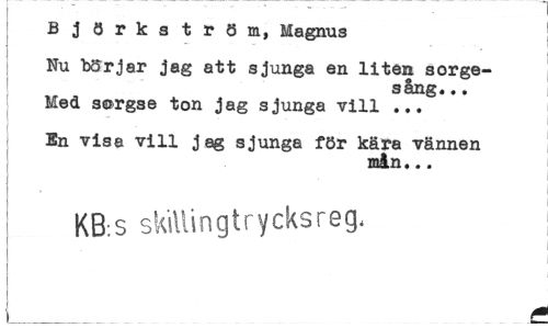 //// Björkström, Magnus //// Nu börjar jag att sjunga en liten sorge- //// s ång... //// Med sorgse ton jag sjunga vill ... //// En visa vill jag sjunga för kära vännen //// mån,.. //// KB.s skiUingt rycks reg, ////