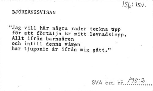 //// ttfe; 'Si/ ¦ //// BJÖRKÄNGSVISAN //// "Jag vill här några rader teckna opp för att förtälja Er mitt levnadslopp. Allt ifrån barnaåren och intill denna våren har tjugonio år ifrån mig gått." //// SVA ccc. n ////