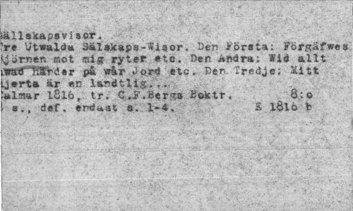 //// ällek&psvi 3or. //// re Utwalda Sälskaps-^iaor. Den första: Förgafwes g örnén mot mig ryter etc. Dem Anära; lid allt .wtfj RItoU* s& wår *J-e.r$ etc. Der». Tredje; &itt j»rt» är en landtlig,,. //// i»imr 1816/ tr. Böktr. 8:0 //// a., def. e ref a ät ft. 1-4. £ lSlo b ////