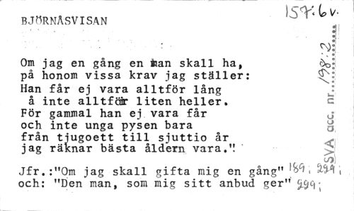 //// ST< U V- //// BJHRNASVISAN '' 1 //// i //// - //// * , • //// Om jag en gång en Man skall ha, öojl //// på honom vissa krav jag ställer: Han får ej vara alltför lång //// å inte alltför liten heller. c //// För gammal han ej vara får j //// och inte unga pysen bara från tjugoett till sjuttio år jag räknar bästa åldern vara.'! //// Jfr.:"Om jag skall gifta mig en gång" [M• WT, och: "Den man, som mig sitt anbud ger" • ////