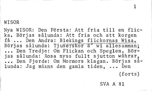 //// 1 //// WISOR //// Nya WISOR: Den Första: Att fria till en flicka. Börjas sålunda: Att fria och att korgen få ... Den Andra: Blekings flickornas Wisa. Börjas sålunda: TjuseTskor a' wi allesamman; ... Den Tredje: Om Flickan och Speglen. Börjas sålunda: Rosa nyss fullt sjutton wåhrar, ... Den Fjerde: Om Mormors klagan. Börjas sålunda: Jag minns den gamla tiden, ... Den //// (forts) SVA A 81 ////