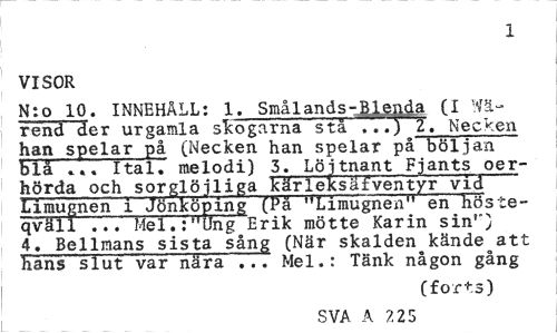 //// i //// VISOR //// N:o 10. INNEHÅLL: 1. Smålands-Blenda (I Wä~ rend der urgamla skogarna sta ...) 2. Necken han spelar på (Necken han spelar på böljan blä ... I tal. melodi) 3. Löjtnant Fjants oerhörda och sorglöjliga kärleksäfventyr vid Limugnen i Jönköping (På "Limugnen" en höste-qväll ... Mel.i" Ung Erik mötte Karin sin'*) 4. Bellmans sista sång (När skalden kände att hans slut var nära ... Mel.: Tänk någon gång //// (forts) //// SVA A 225 ////