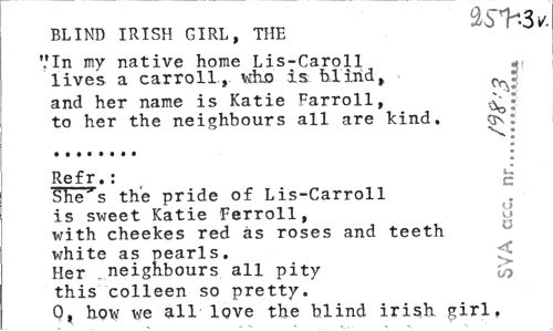 //// BLIND IRISH GIRL, THE V //// Vin my native horae Lis-Caroll lives a carroll., is blind, Cr- //// and her name is Katie Farroll, //// to her the neighbours all are kind, : //// •v: //// Refr.: £ //// She's the pride of Lis-Carroll is sweet Katie Ferroll, with cheekes red as roses and teeth white as pearls. //// Her , neighbours all pity fo //// this colleen so pretty. //// 0, how we all love the blind irish girl. ////