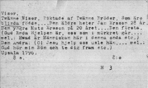 //// Vi sor, //// Twänne Wisor, riktade af Twänne Bröder, 3©m äro Vlijnda f ödde, . . .Pen äldre heter Jan Ersson 28 år Den yni>re Mats krseon på 20 året.,..Pen första, (Gud Rröa Kjelpen är, oss som i mörkret går,.-.. Tel.". Hwad är Människan har i denna onda etc,) Den And ra; (DJ Jesu hjelp oss usle hän,.,, mel.: Gud hör min Bön cch te dig fram etc.) Upsala 1796. //// 8 s. 8: o //// H 3 ////