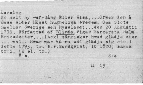 //// L®v»ånst //// Sn helt ny -ef-Sang Eller Wiaa„ . . .ufwer den å Ö*nae aid«r Högst hugneliga Fredeir. Som Slöt» imellan Sweri$e aeh Ry aaland den 20 Auguatii 1790. Författad af Blinda Pigan Margareta Halm Eriead otter, . ,.( Ackl männiakar hwad glädje stor ... m%l,. Hwar mar må nu w&l glädja »ig etc.) Geflo 17V3, tr. K, P.Sundqwiat, ib l8C0, aareaa tr;i„ (2 al. tr.) //// Sa. 6:a //// H i? ////