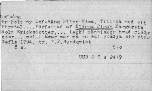 //// - . ¦ : //// 1, of sång //// Er helt ny Lof-Sång Filer sa, Tillika med ett Företal ... .Författad af B^r^ Pigan Margareta" Holm Ericksdetter,... (Ack! människor hwad glädje stor.,, mel .'i. Hwar man må nu väl glädja sig' etc.) Gefle 17^4, tr. E.P.Sundqvist //// 83. e-.o //// UUB Z ? S ?4i9 ////