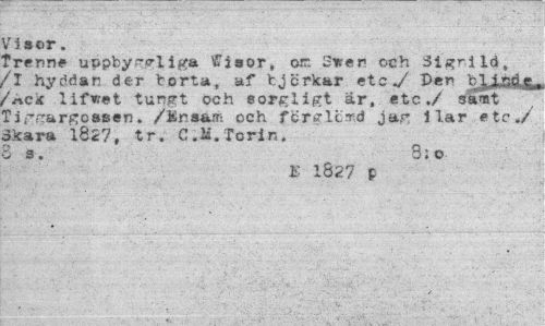 //// Visar. //// frenne uppbyggliga £iaor, on och 3igrild» //// '1 hyddan der borta, af björkar etc J X>en bJiJDåS-'Ack Xifwet tungt och sorgligt är, etc,/ samt tir^argcssen. /lénsam och förglömd jag ilar etc./ 3kara 1827, tr. C.M.Tcrin. //// -O - //// ^ s. 8;o //// E 1827 f ////