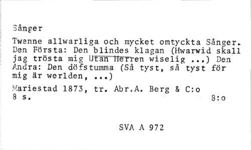 //// Sånger //// Twenne allwarliga och mycket omtyckta Sånger-Ben Första: Den blindes klagan (Hwarwid skall jag trösta mig Uta"fi~'Hérren wiselig ...) Den Andra: Den döfstumma (Så tyst, så tyst för mig är werlden, .,.) //// Mariestad 1873, tr. Abr.A. Berg & C:o 8 s. 8:0 //// SVA A 972 ////