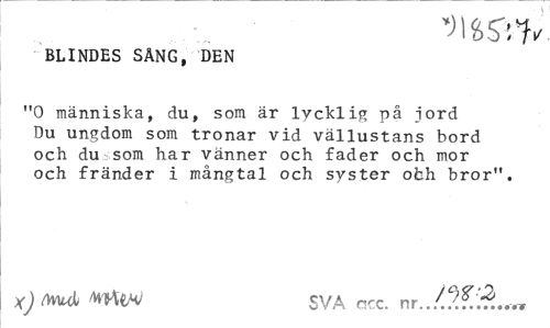 //// BLINDES SÄNG, DEN //// "O människa, du, som är lycklig på jord Du ungdom som tronar vid vällustans bord och du som har vänner och fader och mor och fränder i mångtal och syster ofch bror". //// X)MUl WtW SVA ncc. ////