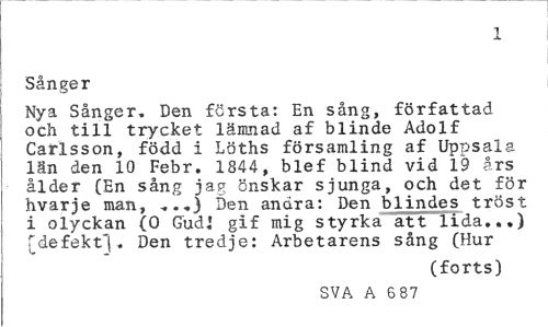 //// 1 //// Sånger //// Nya Sånger» Den första: En sång, författad och till trycket lämnad af blinde Adolf Carlsson, född i Löths församling af Uppsala län den 10 Febr. 1844, blef blind vid 19 års ålder [En sång jag önskar sjunga, och det för hvarje man, Den andra: Den blindes tröst //// i olyckan (O GudJ gif mig styrka att lida...) [defekt"|. Den tredje: Arbetarens sång (Hur //// (forts) //// SVA A 6 87 ////