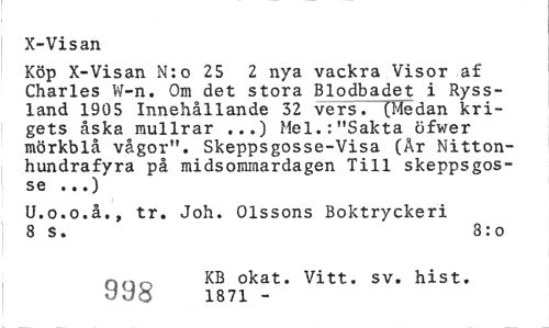 //// X-Visan //// Köp X-Visan N:o 25 2 nya vackra Visor af Charles W-n. Om det stora Blodbadet i Ryssland 1905 Innehållande 32 vers. (Medan krigets åska mullrar ...) Mel.:"Sakta öfwer mörkblå vågor". Skeppsgosse-Visa (År Nitton-hundrafyra på midsommardagen Till skeppsgosse ...) //// U.o.o.å., tr. Joh. Olssons Boktryckeri 8 S. 8:o //// noo KB okat. Vitt. sv. hist. i87i - ////