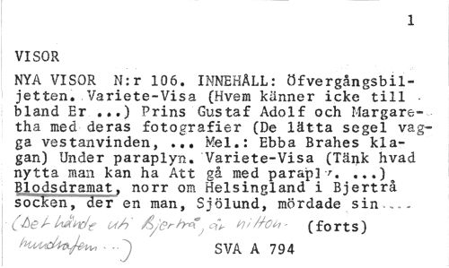 //// 1 //// VISOR //// NYA VISOR N:r 10 6. INNEHÅLL: öfvergångsbil-jetten. Variete-Visa (Hvem känner icke till ¦ bland Er ...) Prins Gustaf Adolf och Margaretha med deras fotografier (De lätta segel vagga vestanvinden, ... Mel.: Ebba Brahes klagan) Under paraplyn. Variete-Visa (Tänk hvad nytta man kan ha Att gå med parap] , ...)o Blodsdramat, norr om Helsingland i Bjertrå socken, der en man, Sjölund, mördade sin.,.. //// (ée/-U&bdt u/) &/erhr*^* mfroh- (forts) //// SVA A 794 ////