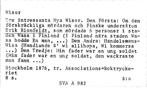 //// Wisor //// Tre intressanta Nya Wisor. Den Första: Om den förskräckliga mördaren och Finske undersåten Erik Blomfeldt, som mördade 6 personer i sta-"den Wasa i Finland (I Finland nära staden Wasa bodde En man, ...) Den Andra: Handelsmans-Wisa (Handlande ä' wi allihopa, Wi kommersa ...) Den Tredje: Min fader war en ung soldat (Min fader war en ung soldat, den wackraste man fann ...) //// Stockholm 1876, tr. Associations=Boktrycke-riet //// 8 s. 8:o //// SVA A 982 ////