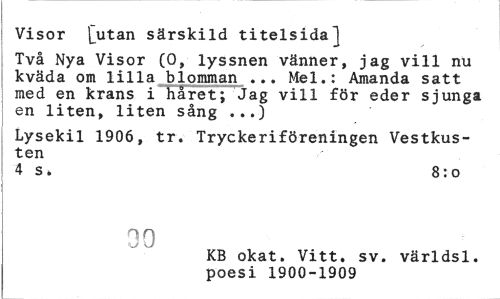 //// Visor [utan särskild titelsida] //// Två Nya Visor (O, lyssnen vänner, jag vill nu kväda om lilla blomman ... Mel.: Amanda satt med en krans i håret; Jag vill för eder sjunga en liten, liten sång ...) //// Lysekil 1906, tr. Tryckeriföreningen Vestkus-ten //// 4 s» 8:0 //// 09 //// KB okat. Vitt. sv. världsl. poesi 1900-1909 ////