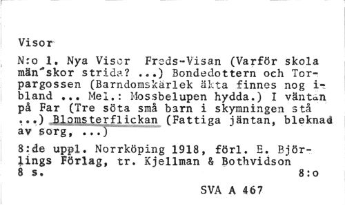//// Visor //// N:o 1. Nya Visor Freds-Visan (Varför skola män"skor strida? ...) Bondedottern och Tor-pargossen (Barndomskärlek äkta finnes nog i-bland ... Mel.: Mossbelupen hydda.) I väntan på Far (Tre söta små barn i skymningen stå ...) Blomsterflickan (Fattiga jäntan, bleknad av sorg, ...) //// 8:de uppl. Norrköping 1918, förl. H. Björ-lings Förlag, tr. Kjellman & Bothvidson 8 s. 8:o //// SVA A 467 ////