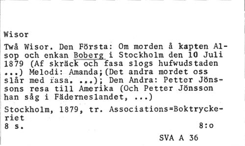 //// Wisor //// Twå Wisor. Den Första: Om morden å kapten Al-sop och enkan Boberg i Stockholm den 10 Juli 18 79 (Af skräck och fasa slogs hufwudstaden ...) Melodi: Amanda;(Det andra mordet oss slår med fasa. ...); Den Andra: Petter Jönssons resa till Amerika (Och Petter Jönsson han såg i Fäderneslandet, ...) //// Stockholm, 1879, tr. Associations=Boktrycke-riet //// 8 s. 8:o //// SVA A 36 ////