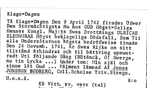 //// Klago^Dagen //// Tå Klago«Dagen Den 9 April 1742 firades öfwer Den Stormächtigsta Nu nos GUD Högst=Saliga Hennes Kongl. Mai:ts Swea DrottAings ULRICAE ELEONORAE Högst beklageliga Dödsfall, Som Til alla Undersåtarnes högsta bedröfwelse timade Den 24 Novemb; 1741, Är Svrea Rijke om Sitt tilstånd ärhindrat och til bättring upmunt-radt Uti följande Sång (BEtänck, 01 Swerge, nu tin Lycka *..) linder ton: Min själ och sinne låt Gud ... Välment lämnad Af Jonas JONSSON BODBERG, Cdl.Scholae Triv.Stregn. //// U.o.o.å. 8:o //// KB Vitt. Sv. vers ftall ////