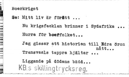 //// : //// jj Boerkriget 3 //// | ie: Mitt liv är förött ... //// 5 Nu krigsfacklan brinner i Sydafrika ... //// d //// | Hurra för boeffolket... //// i Jag gissar att historien till Edra öron //// _ nått... //// = Transvaals tappra hjältar ... //// Liggande på dödens bädd... //// | KB.s skillingtrycksreg, ////