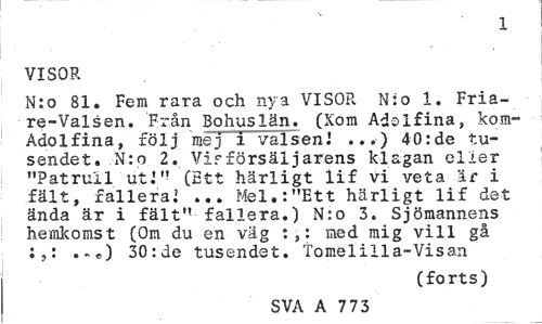 //// 773 //// VISOR //// N:o 81. Fem rara och nya VISOR Nio 1. Fria-re-Valsen. Från Bohuslän. (Xom Adolfina, kom-Adolfina, följ mej i valsen.' ...) 40:de tu-sendet. N:p 2. Vifförsäljarens klagan eller "Patrull ut.'" (Ett härligt lif vi veta är i fält, fallera? ... Mel.:"Ett härligt lif det ända är i fält" fallera.) N:o 3. Sjömannens hemkomst (Om du en väg :,: med mig vill gå :,: ..*) 30:de tusendst. Tomelilla-Visan //// (forts) //// SVA. A 773 0 ////