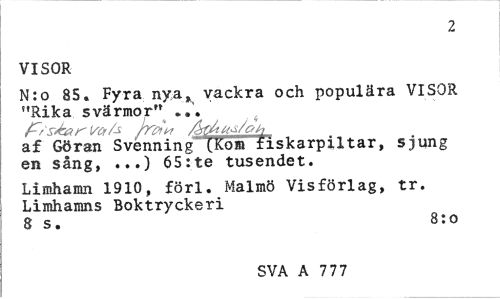 //// 2 //// VISOR //// N:o 85. Fyra nya» vackra och populära VISOR "Rika svärmor" ... //// /^rsJ&r l/Of fe JrftM At/ttt-x/crh //// af Göran Svenning (Kom fiskarpiltar, sjung en sång, ...) 65:te tusendet. //// Limhamn 1910, förl. Malmö Visförlag, tr. Limhamns Boktryckeri //// 8 s. 8:o //// SVA. A 2 0 ////