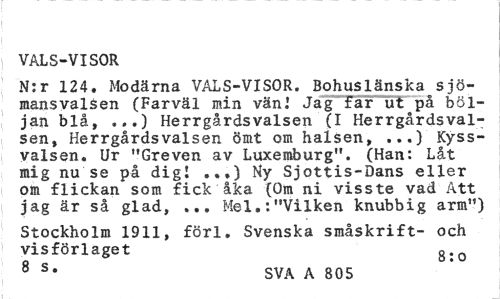 //// VALS-VISOR //// N: r 124. Modärna VALS-VISOR. Bohuslänska sjömansvalsen (Farväl min vän] Jag far ut på böljan blå, ...) Herrgårdsvalsen (I Herrgårdsval-sen, Herrgårdsvalsen ömt om halsen, ...) Kyssvalsen. Ur "Greven av Luxemburg". (Han: Låt mig nu se på dig! ...) Hy Sjottis-Dans eller om flickan som fick åka (Om ni visste vad Att jag är så glad, ... Mel.'."Vilken knubbig arm") //// Stockholm 1911, förl. Svenska småskrift- och visförlaget g:o //// 8 S* SVA A 805 ////