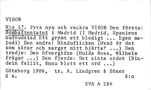 //// VISOR //// N:o 57. Fyra nya och vackra VISOR Den första: Bombattentatet i Madrid (I Madrid, Spaniens hufvudstad Ett grymt ett blodigt ... Egen melodi) Den andra: Hinduflickan (Hvad är det som sårar och sargar mitt hjärta? ...) Den tredje: Den öfvergifne (Hulda Rosa, Wilhelm frågar ...) Den fjerde: Det sista ordet (Bindeln fallit, ännu blott ett ord ...) //// Göteborg 1906, tr, A. Lindgren & Söner 8 s. 8:o //// SVA A 286 ////