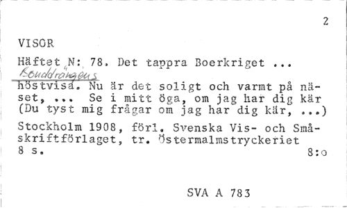 //// 2 //// VISOR //// Häftat N: 78» Det tappra Boerkriget ... //// höstvisä. Nu är det soligt och varmt på näset , ... Se i mitt öga, om jag har dig kär (Du tyst mig frågar om jag har dig kär, ...) //// Stockholm 1908, förl. Svenska Vis- och Småskriftförlaget, tr. Östermalms tryckeriet 8 s. 8: o //// SVA A 10 2 8 ////