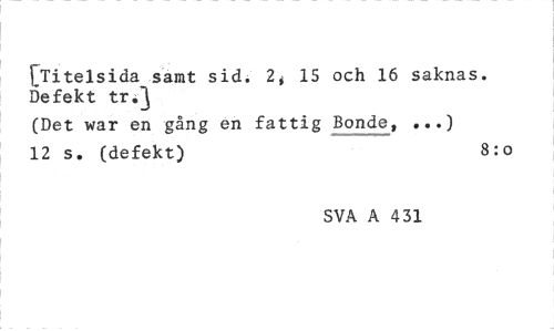 //// [Titelsida samt sid. 2* 15 och 16 saknas. Defekt tr.} //// (Det war en gång en fattig Bonde, ...) 12 s. (defekt) 8:o //// SVA A 431 ////