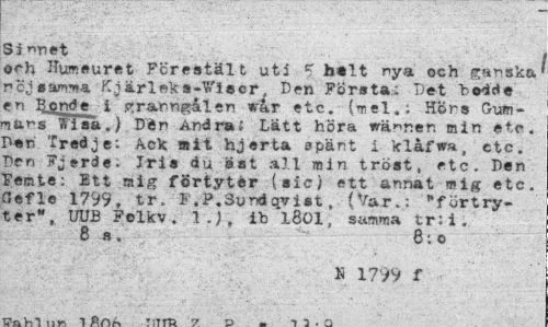//// Sinnet //// ©ch Humeuret Fcrestält uti e-, b»lt nya. och ganska1 rcjsawna Kjärl«ks-^leorf Den Första; Det "bodde en %crtde i p;rar,ngålen w&r etc. {.Tel.: Höra Gum-iars «5iaa.) Dén Andra £ Lätt höra wänrer. min etc. Den Tredje: Ack »it hjerta spänt i klåfwa, etc. Den Fjerde- Iris du est all min tröst, etc. Den Femte: Ett raig förtytér (sic) ett annat wig etc. Gefle 1799, tr, E .P.Sundqvist, (Var.: "ftfrtry-ter",. UUB Felkv . l.J, ib 1801, samma tr:i. 8 s, 8.0 //// K 1799 f ////