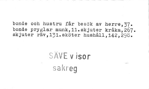 //// bonde och hustru får besök av herre,37. bonde pryglar munk,11.skjuter kråka,267. skjuter räv,131.sköter hushåll,142,298. //// SÄVE v isor sakreg ////