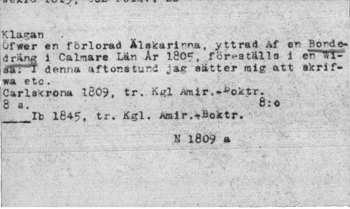 //// Klagan //// öfwer en förlorad Älskarinna, yttrad Af en Bonde-drang i Calmare Lån År 1805, föreställs i erTTS^' ÄT""T denna aftonstund jag sätter mig att skrif- //// wa etc. //// Carlskrona 1SÖ9, tr. Kgl Amir.-^oktr. 8s. 8:0 ___Ib 1845, tr. Kgl. Amir.^-Boktr. //// N 1809 a ////