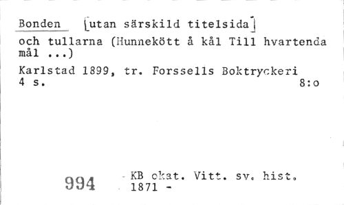 //// Bonden (utan särskild titelsida j //// och tullarna (Hunnekött å kål Till hvartenda mål ...) //// Karlstad 1899, tr. Forssells Boktryckeri 4 s. 8:0 //// nn>i -KB c-kat. Vitt. sv. hist „ //// 994 i87i - ////