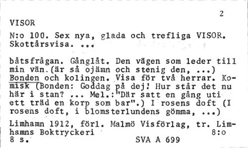 //// 2 //// VISOR //// N:o 100. Sex nya, glada och trefliga VISOR. Skottårsvisa. ... //// båtsfrågan. Gånglåt. Den vägen som leder till min vän.(är så ojämn och stenig den, ...) Bonden och kolingen. Visa för två herrar. Komisk (Bonden: Goddag på dej.' Hur står det nu här i stan? ... Mel.:"Där satt en gång uti ett träd en korp som bar".) I rosens doft (I rosens doft, i blomsterlundens gömma, ..,) //// Limhamn 1912, förl. Malmö Visförlag, tr. Limhamns Boktryckeri 8:o 8 s. SVA A 699 ////