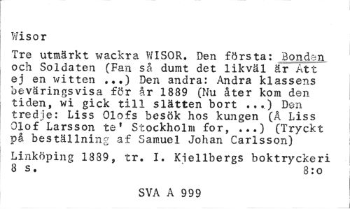 //// Wisor //// Tre utmärkt wackra WISOR. Den första: Bonden och Soldaten (Fan så dumt det likväl är Att ej en witten ...) Den andra: Andra klassens beväringsvisa för år 1889 (Nu åter kom den tiden, wi gick till slätten bort .,.) Den tredje: Liss Olofs besök hos kungen (Å Liss Olof Larsson te' Stockholm for, ...) (Tryckt på beställning af Samuel Johan Carlsson) //// Linköping 1889, tr. I. Kjellbergs boktryckeri 8 s. 8:o //// SVA A 999 ////