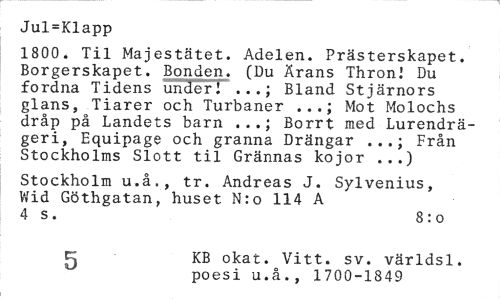 //// Jul=Klapp //// 1800. Til Majestätet. Adelen. Prästerskapet. Borgerskapet. Bonden. (Du Ärans ThronI Du fordna Tidens under 1 ...; Bland Stjärnors glans, Tiarer och Turbaner Mot Molochs //// dråp på Landets barn Borrt med Lurendrä- //// geri, Equipage och granna Drängar ...j Från Stockholms Slott til Grännas kojor ...) //// Stockholm u.å., tr. Andreas J. Sylvenius, Wid Göthgatan, huset N:o 114 A 4 s. 8 : o //// 5 KB okat. Vitt. sv. världsl. //// poesi u.å., 1700-1849 ////
