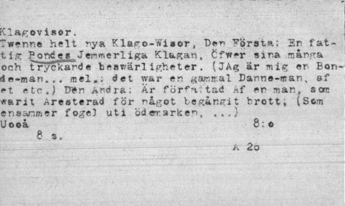 //// Clagevisor. //// rwenne helt rya Klago-Wi»or, De^ Törsta; Sr. fat-tis Pondes.Jemmerliga Klagan, Cfver sina manfta och rryckarde beswärli^heter. (Jåg är mig er Bon-ie-man... mel.; det war en gammal Banne-man, af »t etc.) T7<*n Andra; Är för*"-v: tari Af en nar, som wari t Aresterad för något be^aneit brott, (Som 5nsanmer foge} uti öder.arken, ..,} Jooå 8: o //// 8 s. //// A 2o ////