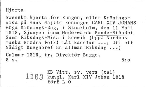 //// Hjerta //// Swenskt hjerta för Kungen, eller Krönings* Wisa på Hans Maj:ts Konungen CARL XIV JOHANS Höga Krönings=Dag, i Stockholm, den 11 Maj i 1818, Sjungen inom Hederwärda Bonde=Ståndet Samt Riksdags=Wisa i Enewik (UppI " Nordens raska Brödra Folk! Låt känslan Uti ett //// Nådigt Kungabref En allmän Riksdag ...) //// Calmar 1818, tr. Direktör Bagge. 8 s. 8:o //// KB Vitt. sv. vers (tal) 1163 kungl. Karl XIV Johan 1818 förf L-ö ////