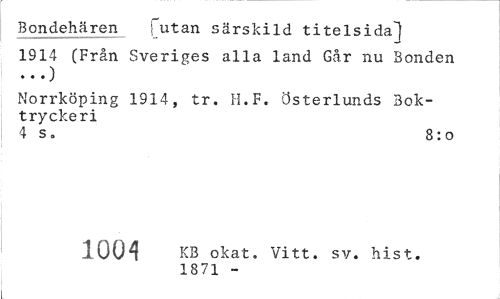 //// Bondehären i utan särskild titelsida~J 1914 (Från Sveriges alla land Går nu Bonden //// Norrköping 1914, tr. H.F. österlunds Boktryckeri //// 4 s. 8:o //// IQQ^j KB okat. Vitt. sv. hist. 1871 - ////