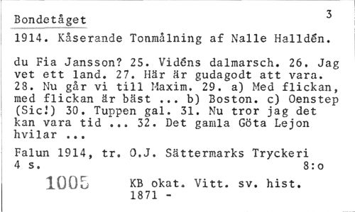 //// 3 //// Bondetåget //// 1914. Kåserande Tonmålning af Nalle Halidén. //// du Fia Jansson? 25. Vidéns dalmarsch. 26. Jag vet ett land. 27. Här är gudagodt att vara. 28. Nu går vi till Maxim. 29. a) Med flickan, med flickan är bäst ... b) Boston, c) Oenstep (Si c I) 30. Tuppen gal. 31. Nu tror jag det kan vara tid ... 32. Det gamla Göta Lejon hvilar ... //// Falun 1914, tr. O.J. Sättermarks Tryckeri 4 s. 8:o //// löOu KB okat, Vitt. sv. hist. //// 1871 - ////