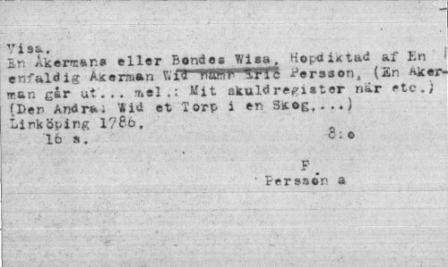 //// Visa. //// En Åkerrtftr.» eller Bondes Wisa, Kopdiktad af En enfaldig Åkerman Persson, (En åker //// man går ut... i»el .: Mit skuldregister nir etc.; (Den Andra; "fcid et Torp i en 3stog,...j Linköping 1786, //// 16 fi. 3: o //// F //// ' Persson a ////