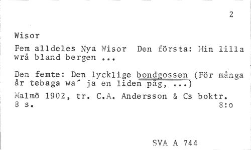 //// 2 //// Wisor //// Fem alldeles Nya Wisor Den första: Min lilla wrå bland bergen ... //// Den femte: Den lycklige bondgossen (För många år tebaga wa' ja en liden pag, ...) //// Malmö 1902, tr. C.A. Andersson & Cs boktr. //// 8 s. 8:o //// SVA A 744 ////